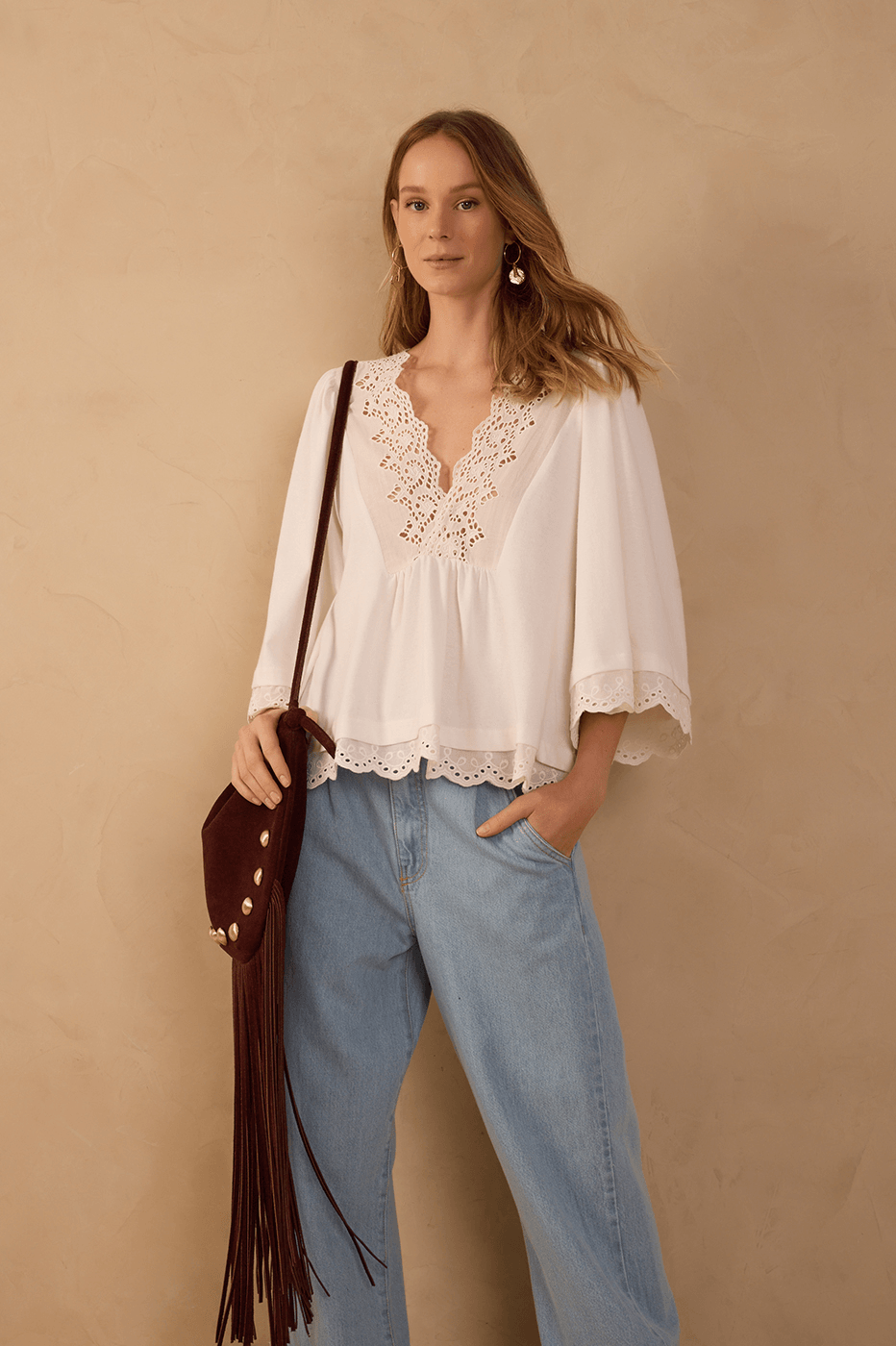 Delicada, leve e atemporal. A bata de comprimento regular, possui caimento soltinho, mangas ¾, decote v e detalhes em renda. Perfeita!