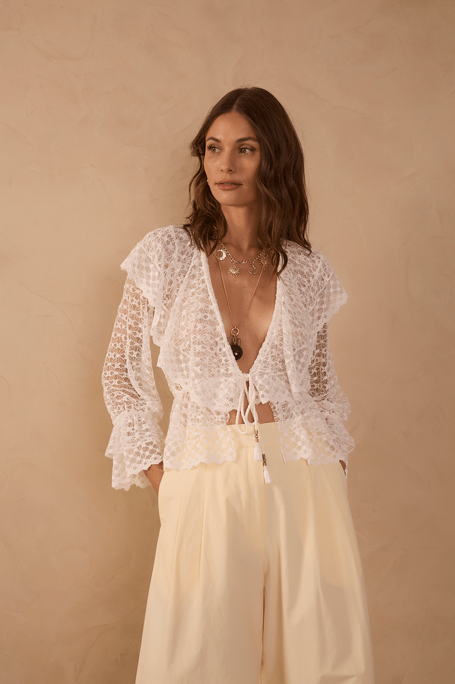 Pensada para mulheres modernas, elegantes e estilosas. A bata renda babado possui decote em V com fechamento por botão e amarração, as mangas longas contam com punhos ajustados e o shape moderno traz feminilidade com um toque ousado para a produção.