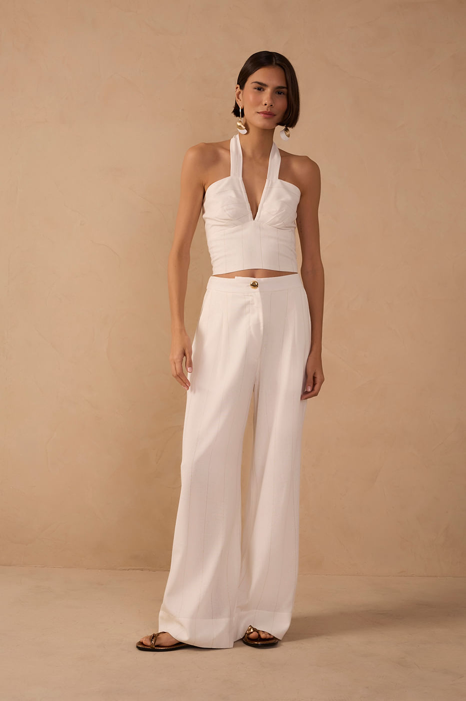 Calça Linho Risca Lurex une o toque natural do linho ao brilho discreto do lurex, criando um visual sofisticado e cheio de leveza. A risca sutil alonga a silhueta, enquanto o caimento fluido traz conforto e elegância para o dia a dia.