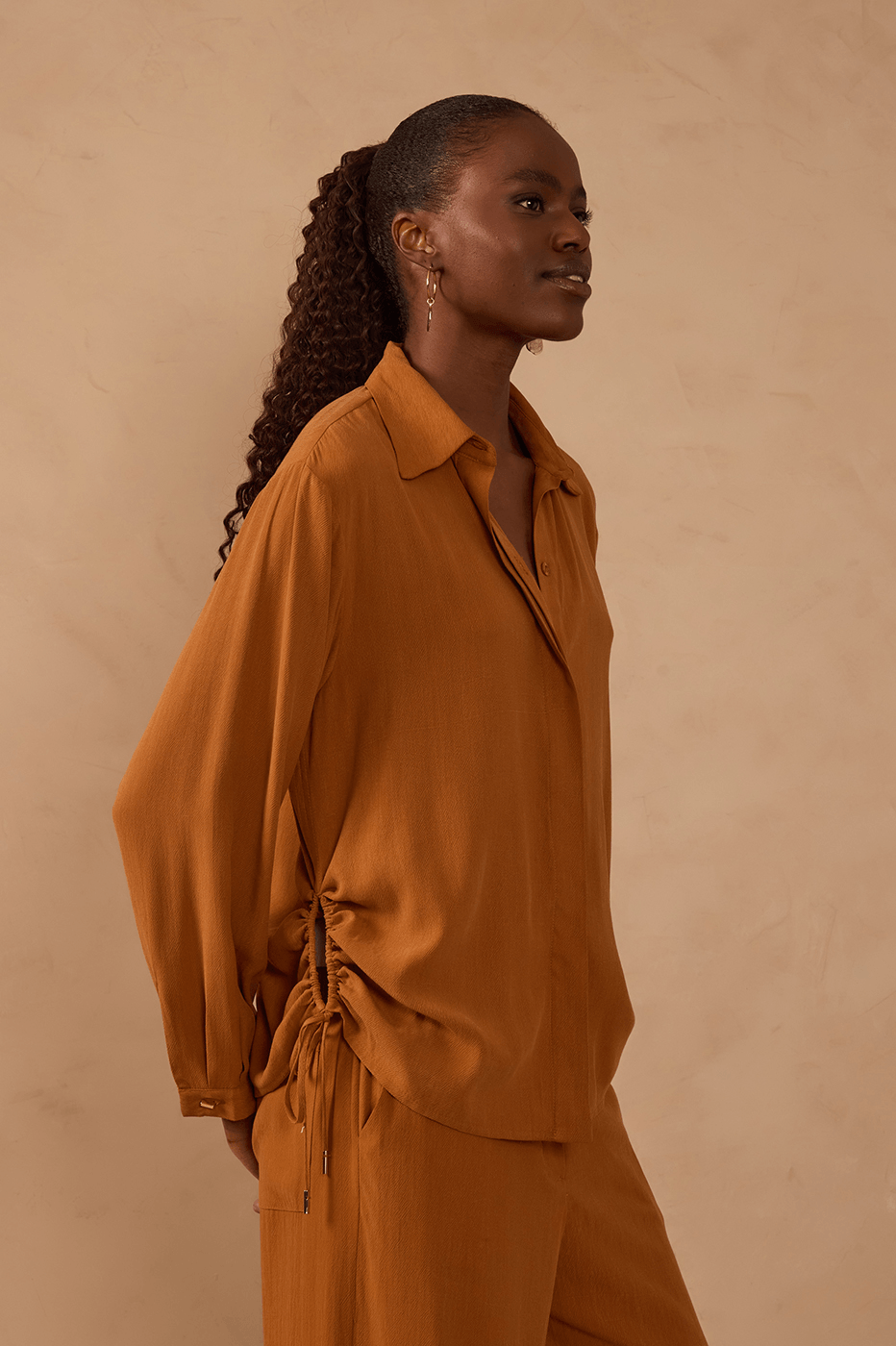 camisa de shape soltinho, possui comprimento alongado, mangas longas com punhos ajustados, gola colarinho e fechamento frontal por botões. O charme fica por conta da regulagem por amarração nas laterais, proporcionando autenticidade ao visual.