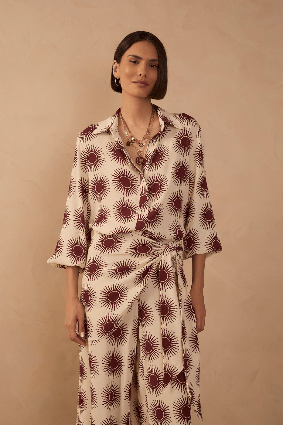 camisa estampa solaris possui shape soltinho, mangas longas, punhos ajustados, comprimento alongado, gola colarinho e fechamento frontal por botões.