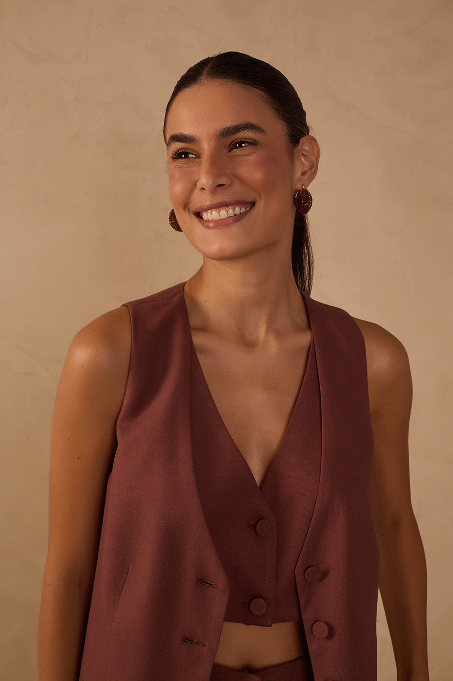 Versatilidade, modernidade e elegância. Com comprimento alongado e decote em V, o colete sobreposição é produzido em linho, com botões forrados e pode ser usado fechadinho, para um visual mais alinhado, ou aberto, revelando o colete interno que dá um toque superestiloso ao look.