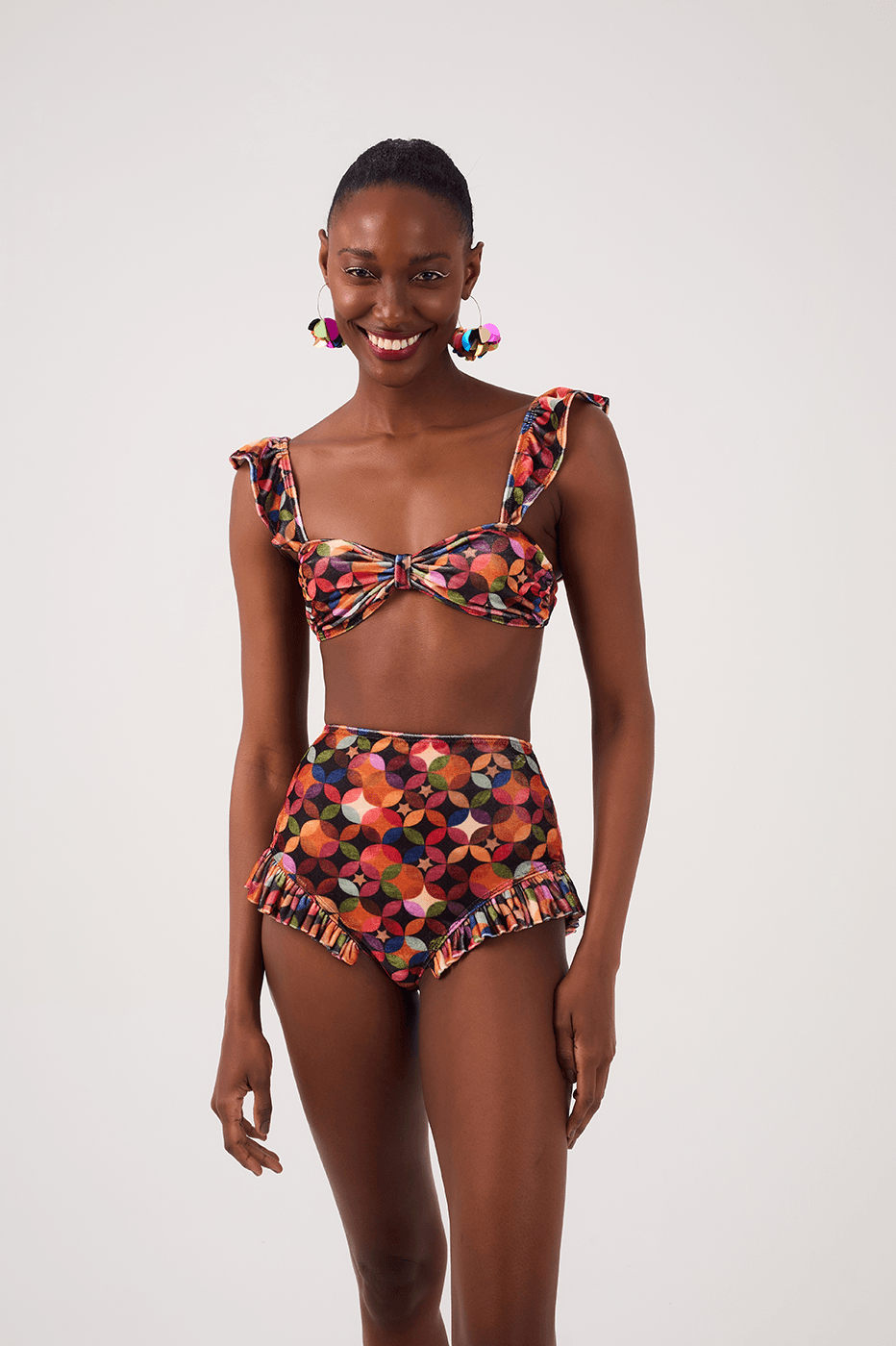 conjunto estampa estelar é produzido em veludo e é composto por hot pant com babadinho e top marcadinho no busto, alças com babados e amarração nas costas para melhor ajuste ao corpo.