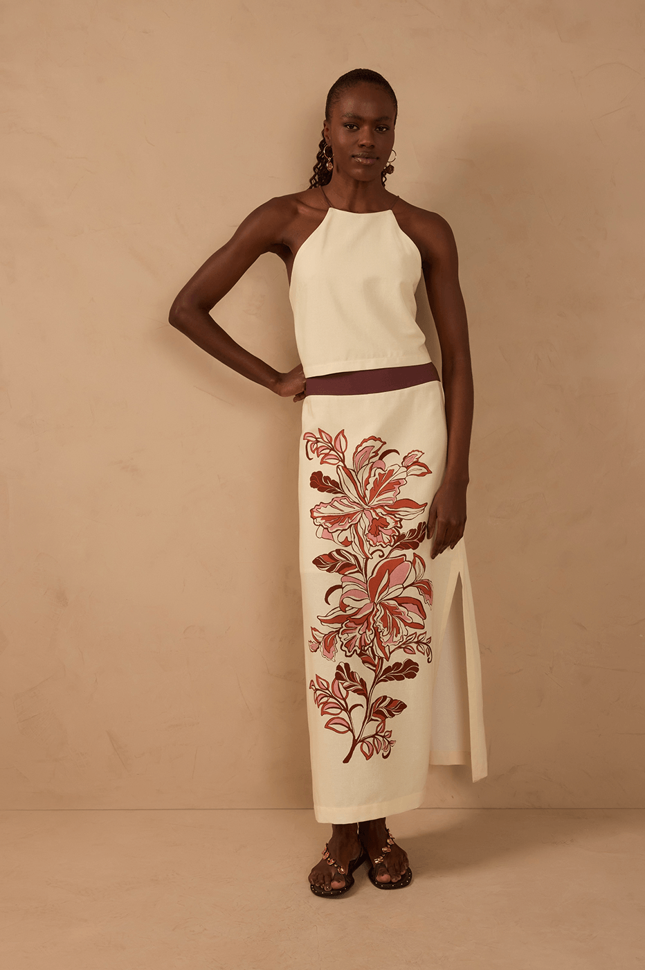 conjunto em linho estampa Flor da Manhã, possui um visual leve e elegante. A saia longa possui cintura alta e fendas laterais que trazem movimento e feminilidade. A blusa tem comprimento cropped, alças finas e amarração nas costas, garantindo um toque delicado e moderno ao look.