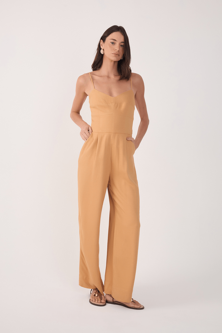 Sinônimo de praticidade e elegância. O nosso macacão possui a parte superior ajustada, com decote levemente em v, alças finas reguláveis e lastex nas laterais. Já a parte inferior conta com pregas frontais, bolsos e calça soltinha.