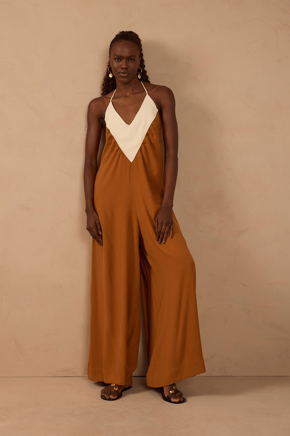 Caimento perfeito, leve e elegante. O macacão de frente única com amarração no pescoço, possui decote V com pala e modelo pantalona. Perfeito!