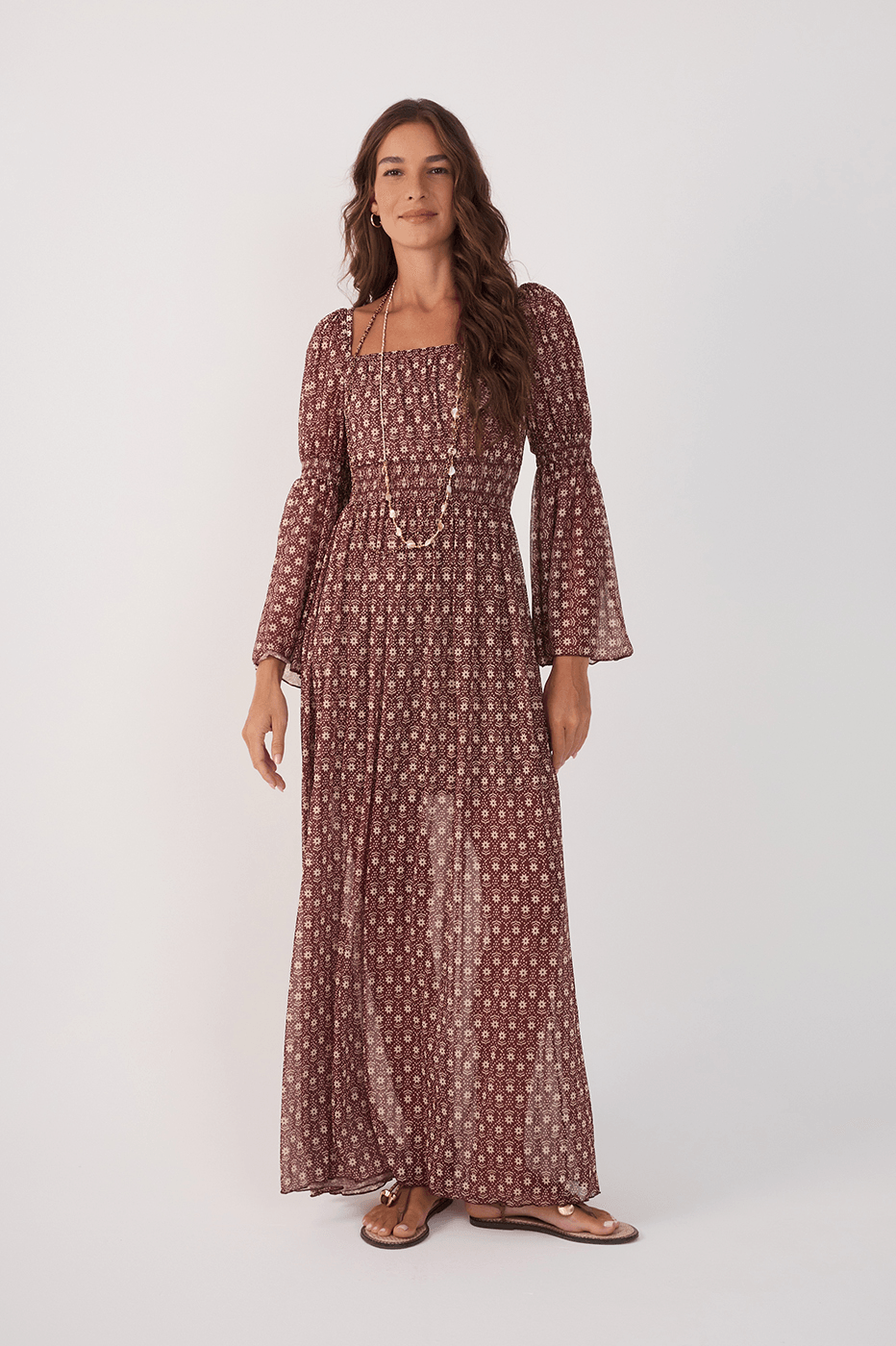 vestido bata estampa essência é produzido em tule, possui comprimento longo, a parte superior em lastex marcando a silhueta de forma sutil e delicada. As mangas longas e o decote reto valorizam o visual transmitindo mais leveza para os seus dias.